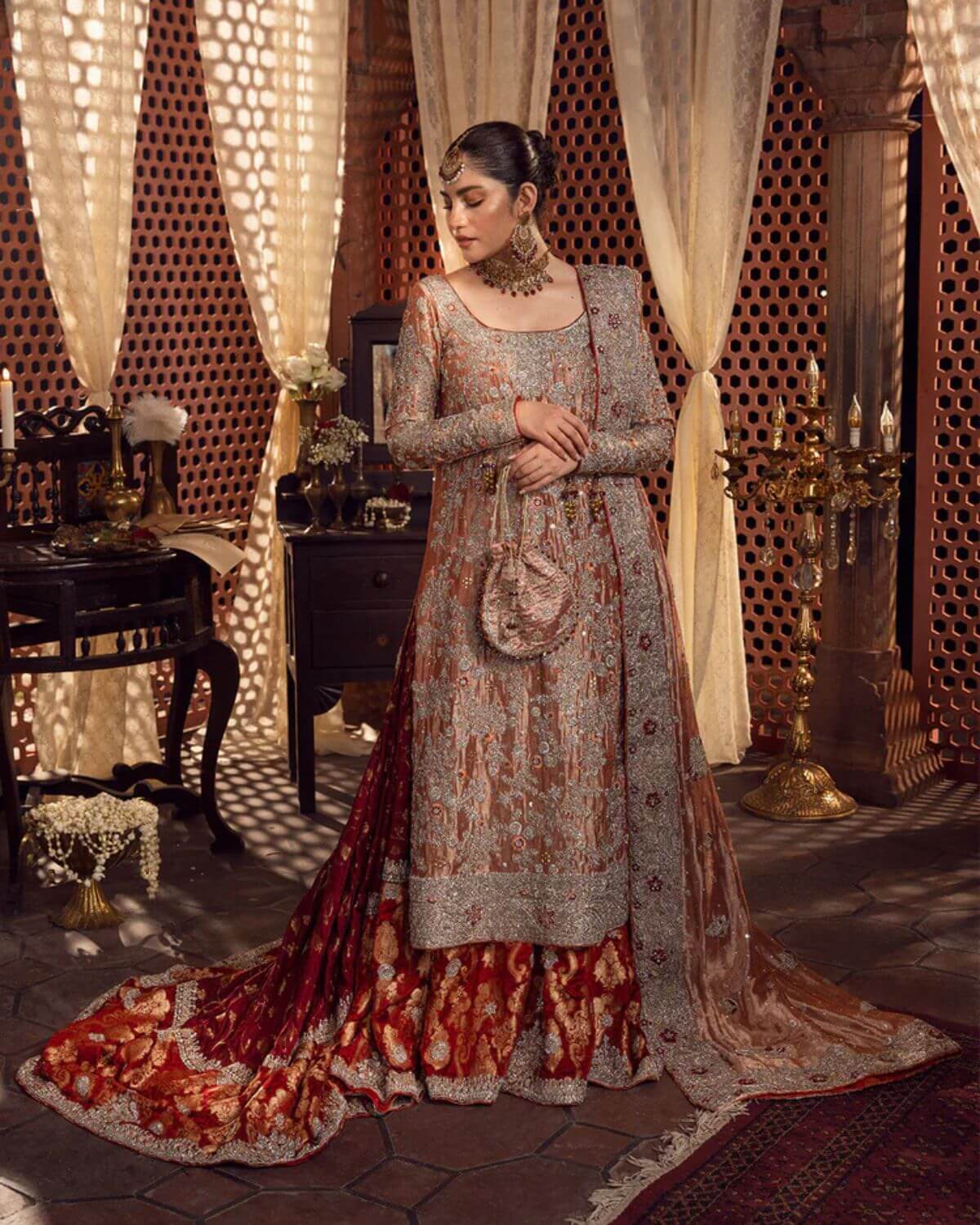 The perfect look for a Classic Reception bride. Soft champagne, silver and mint green are blended in harmony, decorated with dazzling silver and gold zardozi embellishment for a stunning effect. Signature 'jhaalar' motifs with French knots and dapka add a delightful femininity. Purely handmade, this heirloom creation is sure to be cherished for decades to come.