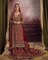 A three piece bright red bridal featuring traditional floral motif and vines rendered using dabka, marori, resham zardozi among other techniques.