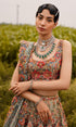 Intricate mirror work on a sage green base with elaborate hand detailing, and a beautifully mirror work bordered net dupatta.