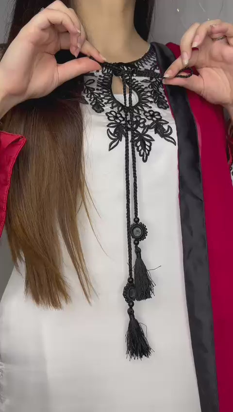 Elevate your wardrobe with this exquisite 3-piece formal suit, crafted from premium silk for a smooth and luxurious finish. Featuring intricate black machine embroidery on a pure white base, this outfit exudes timeless elegance. The set includes an embroidered kurta, matching silk trousers, and a contrasting red dupatta with black finishing—perfect for weddings, parties, and festive occasions.